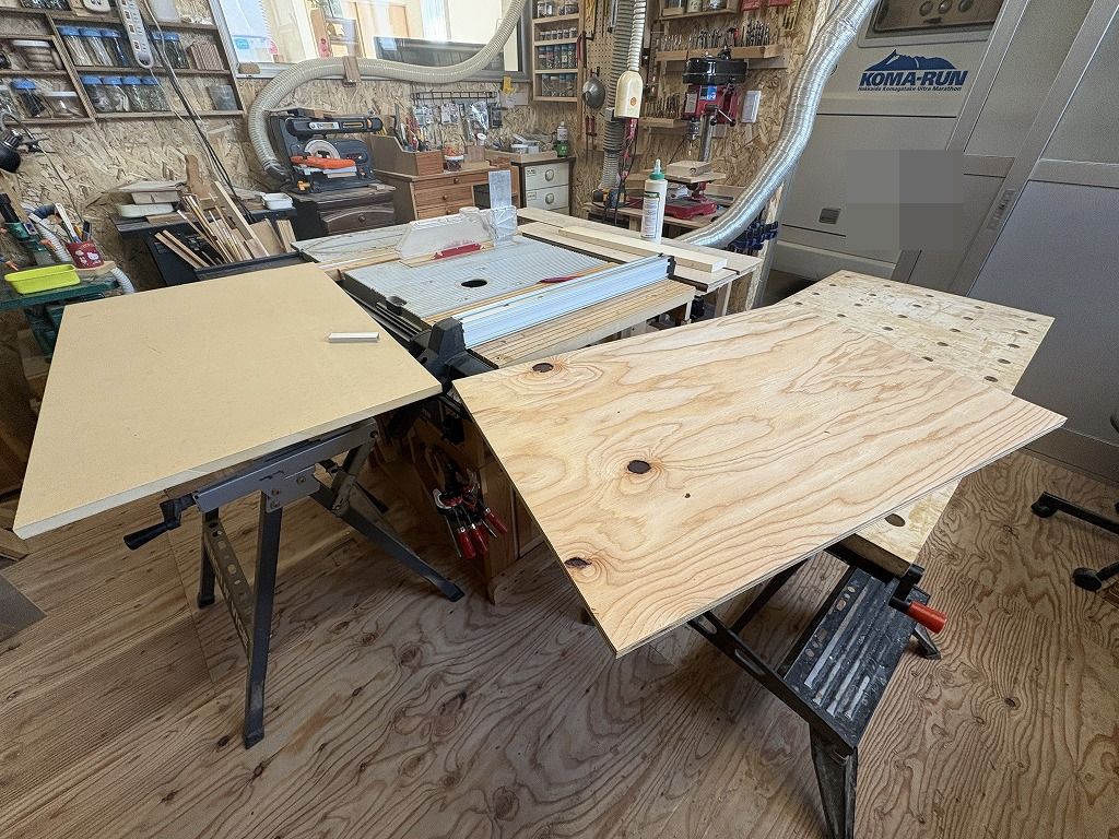 今までの作業台とテーブルソーと同じ高さで使いやすくしています。手前の作業台がそうです